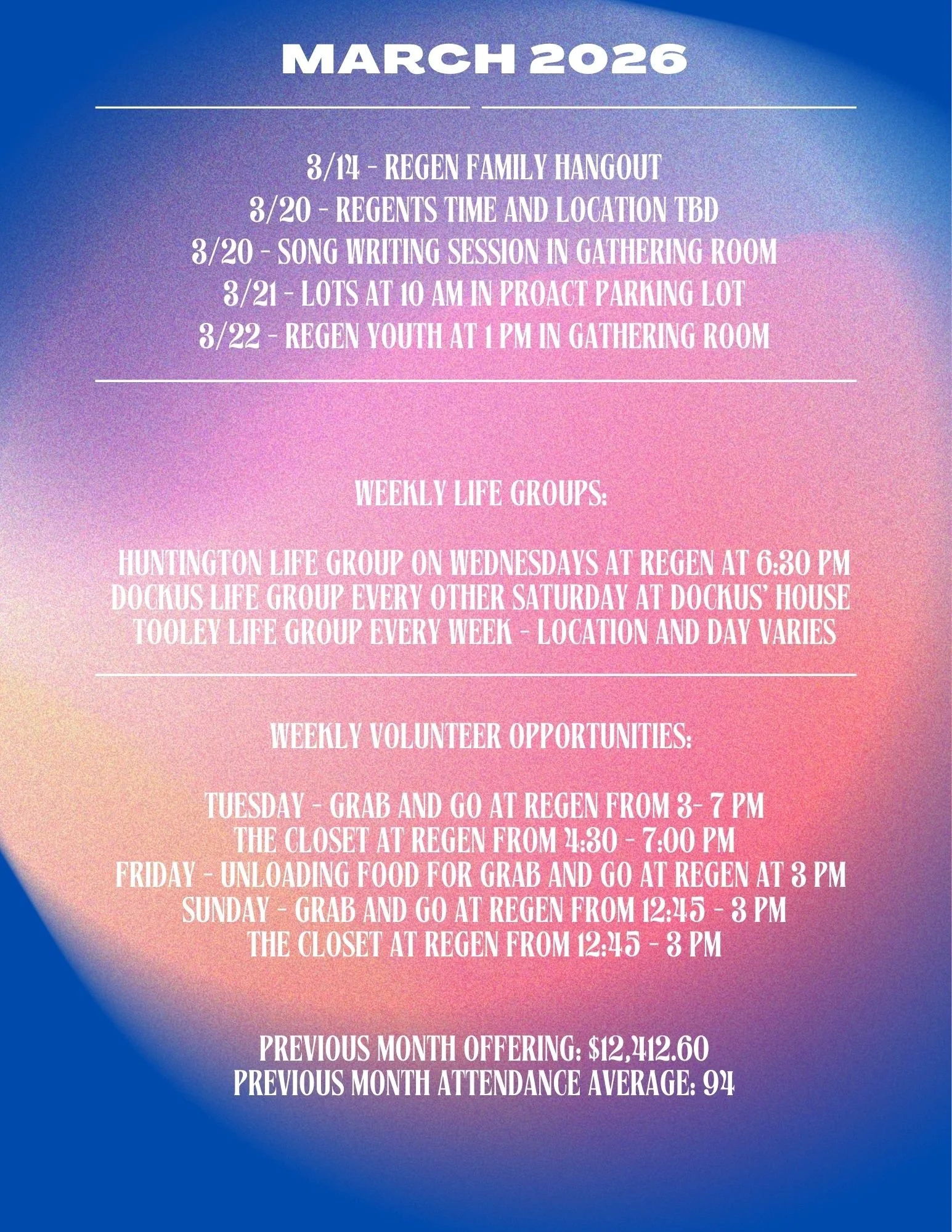Welcome to reGen at a glance, we are so happy to share with you EVERYTHING that is happening at reGen this month. Our food pantry, reGen Grab and Go is open from 5 pm to 7 pm on Tuesdays AND we have two life group options available in Huntington and Barboursville on Wednesdays. Wednesday is a great day to get connected here! Sunday we have our gathering at 10:30 am, clothing sorting in our clothing pantry at 12:30 pm, and Grab and Go and The Closet from 1 pm - 3 pm.